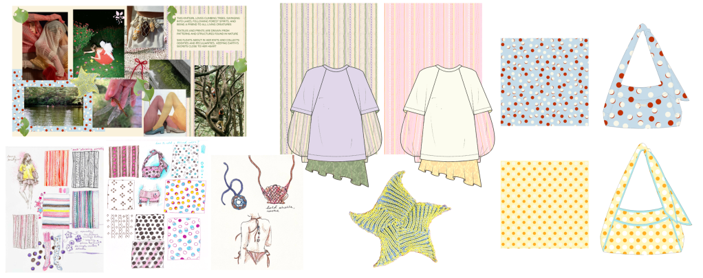 Knit swatches, accessories, and print designs for layered tees and bags inspired by vintage tight patterns.