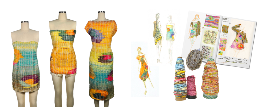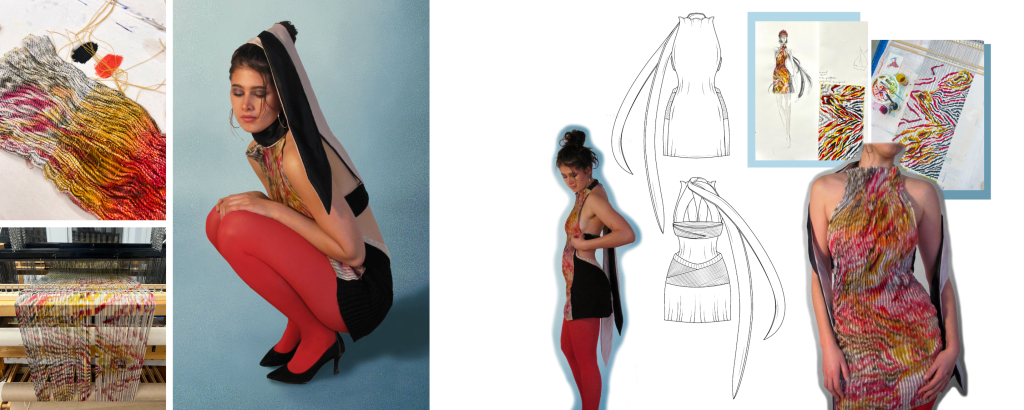 Hand painted warp, woven on the floor loom, hand pleated, Silver Reed SK280 knitting machine, hand knitting.