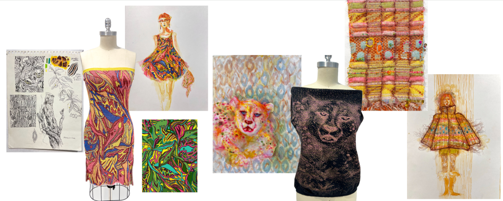 This collection began after sketching and collaging about my experiences working children’s birthday parties, and how childhood memories shift in meaning as we grow older. I created a series of knit swatches that culminated in a fully fashioned knit leotard and knit balloon accessories.